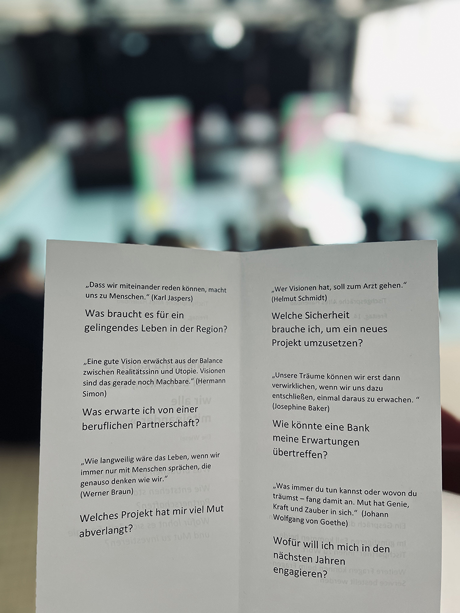 Der Mut, auch Themen aufzugreifen, die nicht unbedingt im Portfolio einer Bank stehen, macht den Beteiligten Hoffnung. Handschlagqualität, Vertrauen und die Offenheit für Menschen wurden als Qualitäten genannt, die die Region für ein gelingendes Leben braucht. Das gute Miteinander als Schlüssel für Veränderungen, die von allen mitgetragen werden, und der Wunsch nach regelmäßigen Begegnungszonen waren den Gesprächen ebenso zu entnehmen.