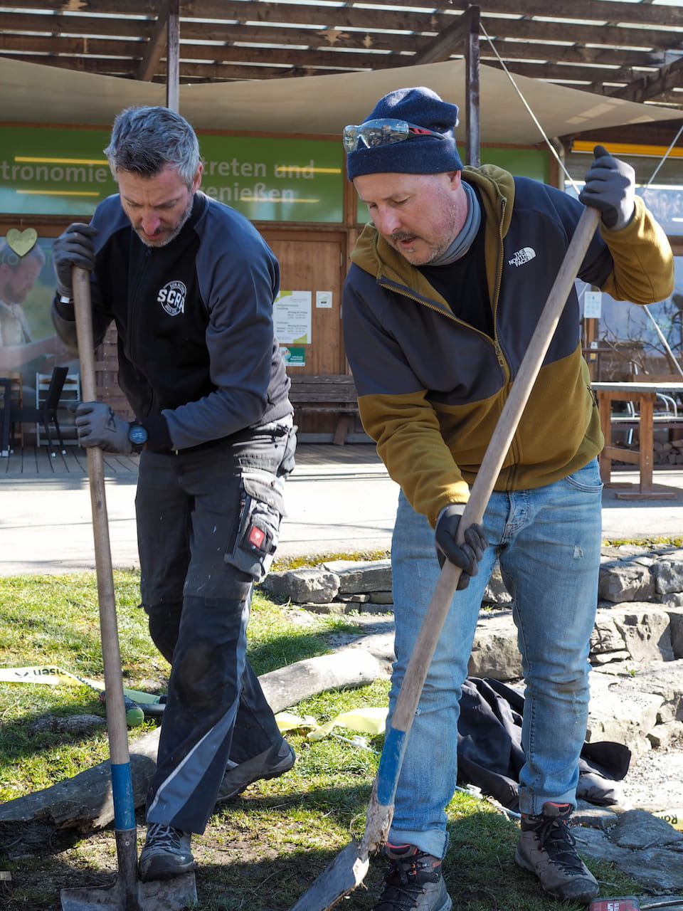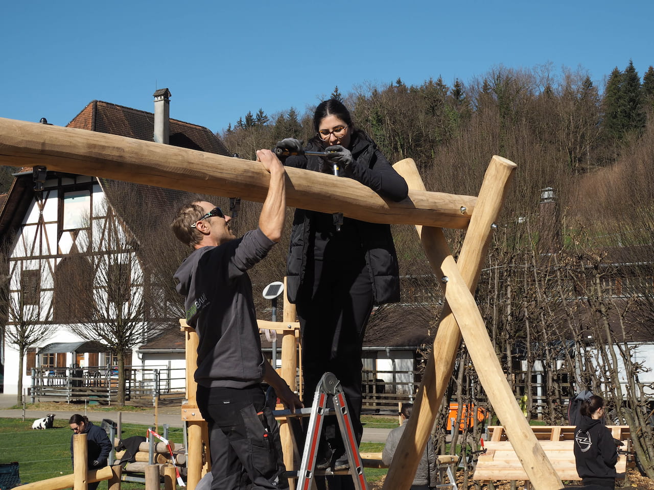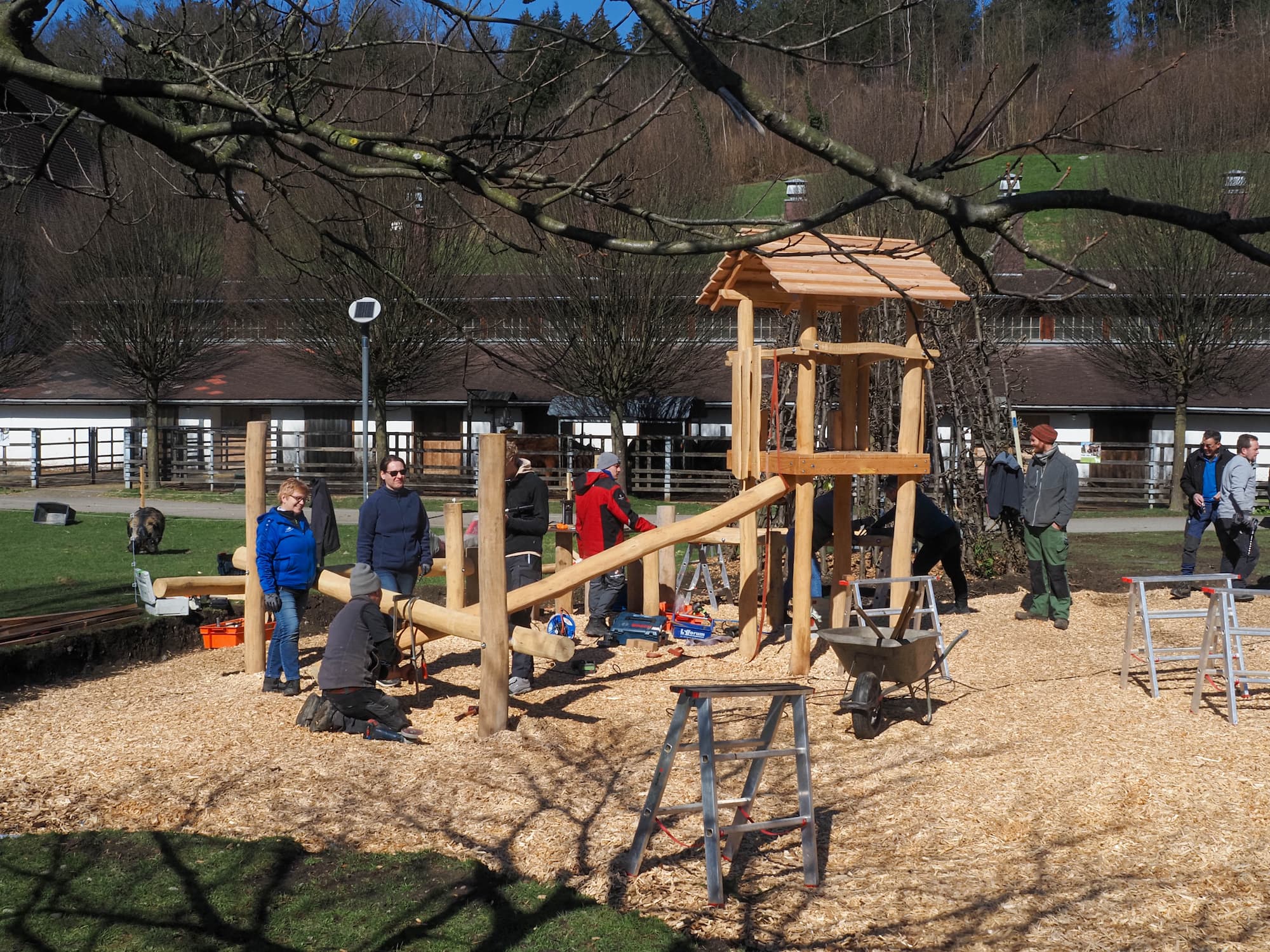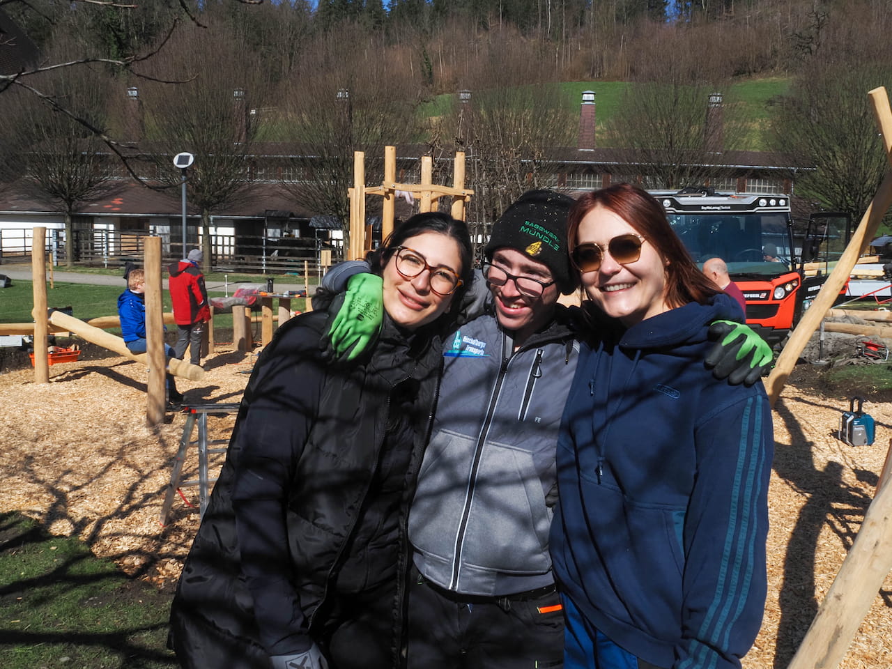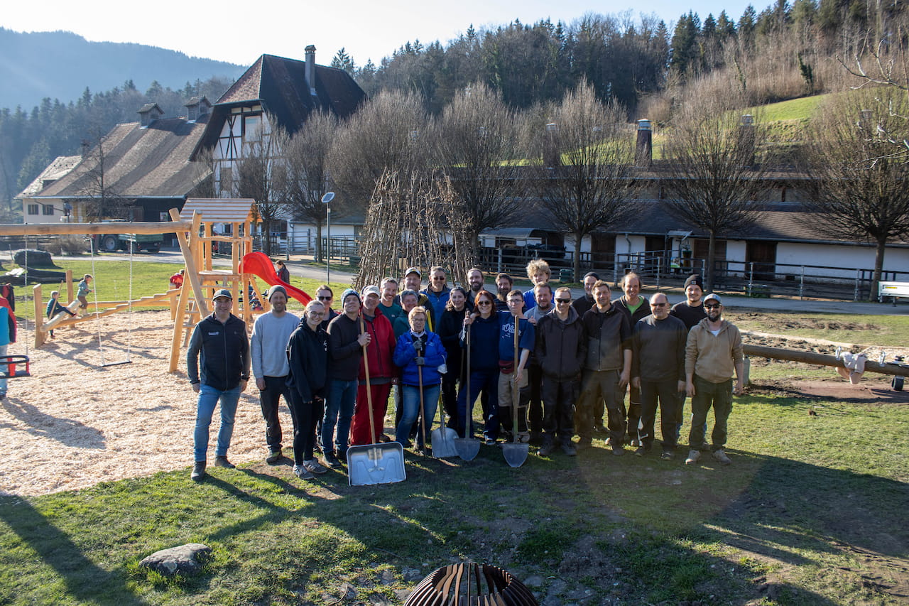 Bereits am frühen Morgen tauschten wir unsere Büro- und Schalterarbeitsplätze gegen Bohrmaschine, Kettensäge und Schaufel. Unter der Anleitung des AQUA Mühle-Teams und gemeinsam mit den am Sunnahof beschäftigten Menschen mit Behinderung wurde den ganzen Tag über fleißig gearbeitet. Am Abend war es dann soweit: der neue Spielplatz war fertig und bietet den Kindern nun einen Ort, an dem sie unbeschwert spielen und Gemeinschaft erleben können.